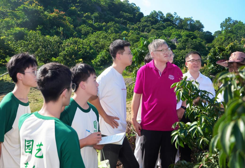 7月24日,华南农业大学园艺学院院长胡桂兵、党委副书记李伟一行实地考察荔枝种植基地并慰问了突击队师生。胡桂兵重点调研了果树生长状况与果实品质,针对果农反映的修剪、施肥、病虫害防治等技术难题提供专业指导,就荔枝产业结构性升级提出建设性意见,并与当地深入探讨了产学研合作路径,为后续校地合作奠定了良好基础。